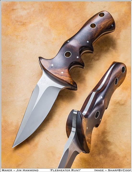 The Flesheater™ Runt™ is the wilderness survival and woods craft design in the Flesheater™ series. Some former Army guys who’d done survival training with the British military spent a day in the shop sharing their ideas and request for this knife. These are the features that they wanted incorporated into this design: