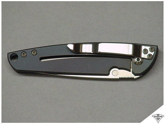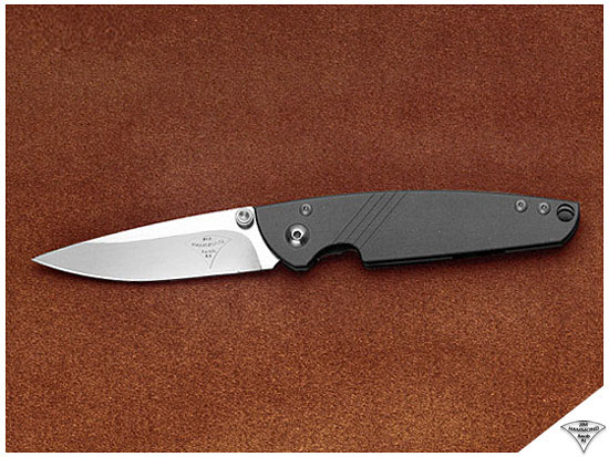 The Mirage titanium framelock gentleman’s folder combines tasteful elegance in a sleek, lightweight package. Weighing a mere 2 ounces, the knife virtually disappears when clipped in either your pants or shirt pocket. When open, a delicate set of thumb serrations on the back of the blade is perfectly placed for grip security. The back line of the handle frame flows downward slightly to expose the serrations on the blade, while the blade becomes the extension of this visual line toward the point of the knife. The knife has an open-frame construction with threaded shafts providing support. The perimeter of the titanium frames is radiused for maximum comfort. The thumbstud has a cupped head with a knurled collar for easy capture by the thumb. The clip profile follows the contours of the back of the handle and the teardrop shaped spring arm cutout slot on the reverse side. For customers opting to order a Mirage without the clip, an exquisite leather pouch is available as an option. The blade has a “frosted satin” finish in the bevels, with a higher polished satin on the flats. The serrations and blade back have a micro-glass bead-blast finish, and the flats along the blade perimeter have a hand-rubbed satin. The titanium frames have a soft bluish-purple satin finish, which add to its refined appearance. The Mirage framelock folder is the smallest Hammond Knives folder, and fills the bill as an elegant gentleman’s folder with a modern day style.